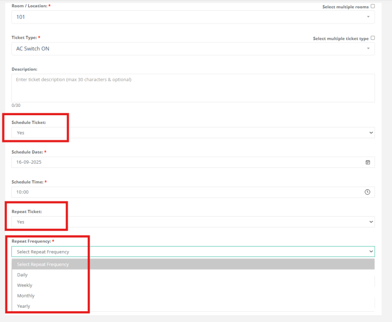 Step 2: Select the room number, choose the ticket type, mark Scheduled Tickets= YES, and set the scheduled date and time.